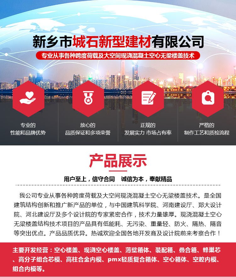 我公司主要從事各種跨度荷載及大空間現(xiàn)澆混凝土空心無(wú)梁樓蓋技術(shù)。是全國(guó)建筑結(jié)構(gòu)創(chuàng)新和推廣新產(chǎn)品的單位,與中國(guó)建筑科學(xué)院、河南建設(shè)廳等多個(gè)設(shè)計(jì)院緊密合作。...